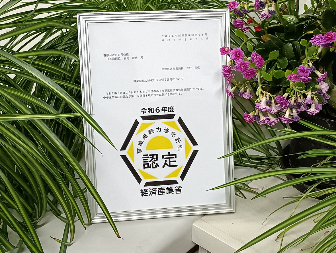 弊社として、自然災害などの災害リスク等を認識しながら事業活動への物理的ダメージなどを踏まえ、弊社としての『水』にかかわる仕事・事業活動が早期再開・継続できるように事前対策や取組方法を計画し認定をいただきました。