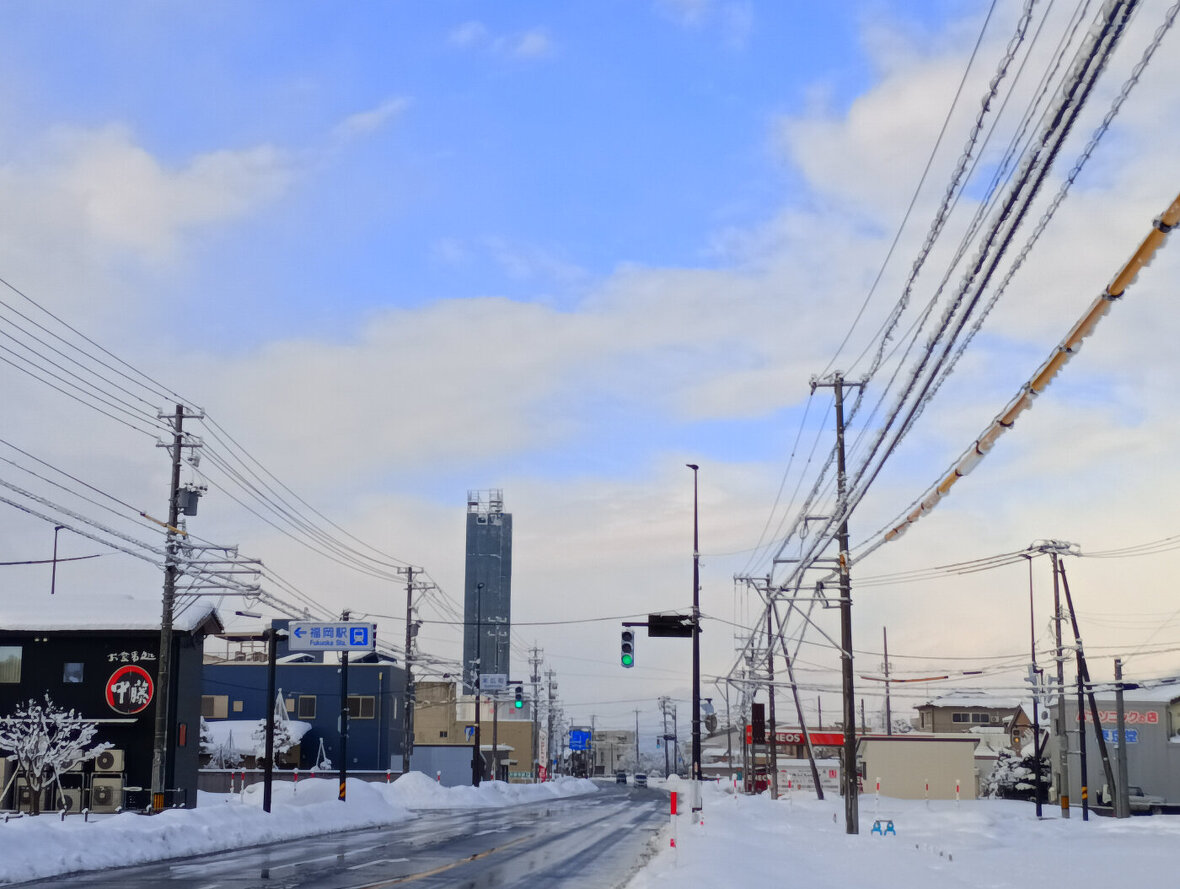弊社は道路除雪は行っておりませんので深夜・早朝の除雪作業に係わる方々には毎朝感謝しておりますが、道路の消雪散水の点検業務に携わらせていただいております。いつも道路面の散水がうまく稼働しているかをパトロールしているのですが、ある時、ふと遠くを眺めると、あらっビックリ!