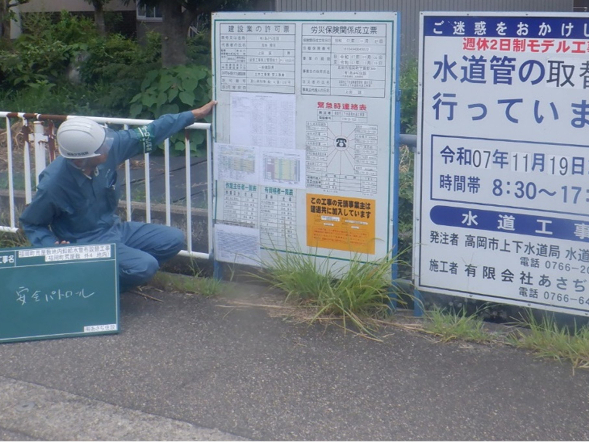 福岡町の神明宮のご近所にて高岡市上下水道局さま発注の水道管の取替工事をさせていただいております。狭い道路での掘削・管取替・埋戻作業なので部分的に通行止めとさせていただいております。