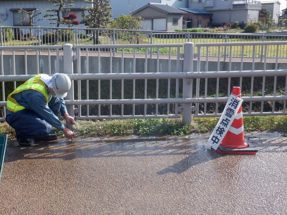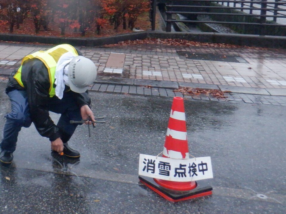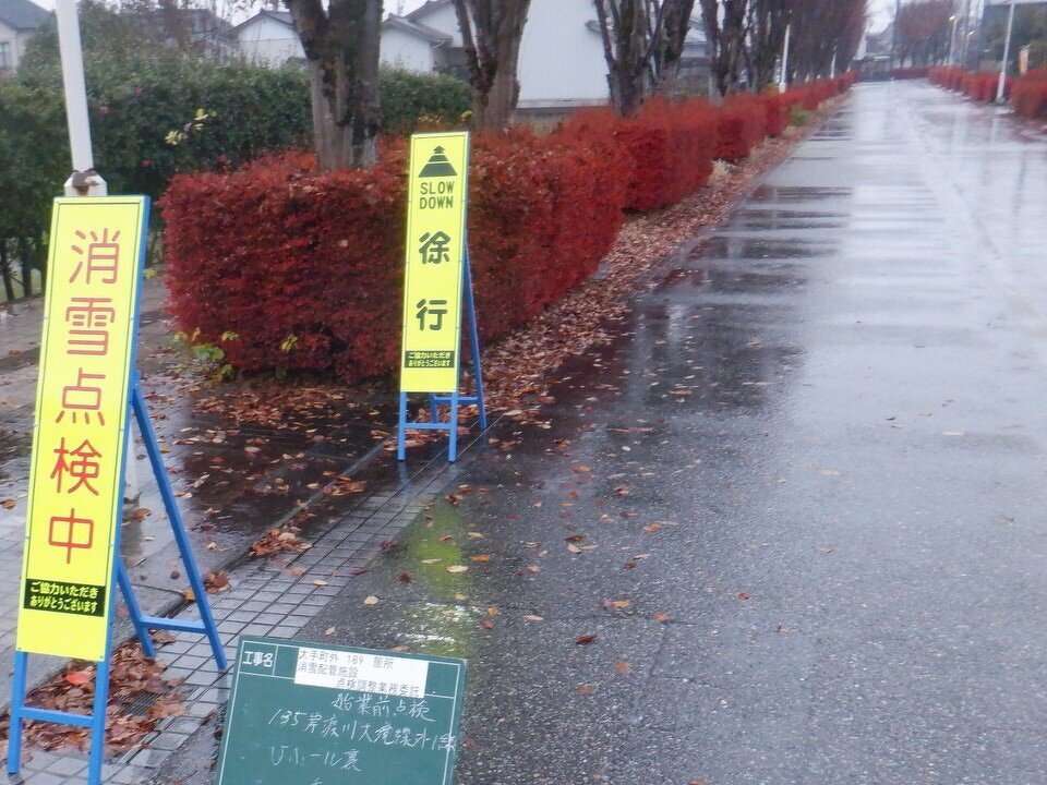 弊社としても冬支度のひとつである公道の消雪散水の点検をさせて頂いております。降雪の際には住民の皆さまの足をお守りすべき消雪散水がしっかり機能してほしいと思いながら、道路のセンターラインにお邪魔し、歩行者の皆さまに水が飛ばないように気をつけながら作業させて頂いております。